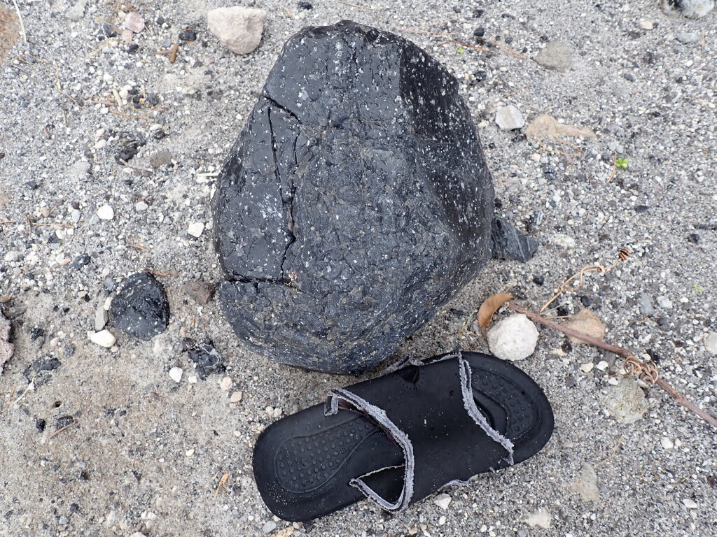 地面は火山灰な砂地で安定しないし、自分よりも大きな石が今にも転がってきそうな場所に落ちてるし、見えない穴が開いてて足踏み外しそうになるしで、生きた心地がしませんでした・・・。上の写真のように、道路だったところに大型の石が我が物顔で鎮座している様を見ると、人は自然の猛威の前には無力なんだな・・・、と、しみじみ感じました。