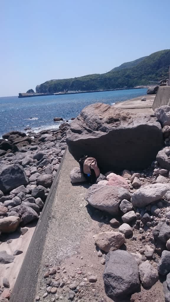 ここの黒曜石は、神津島エリアの中では恩馳島の次点で質が良いですが、ヒビと白い点々が多く入っていてあまり石器には向いてません。