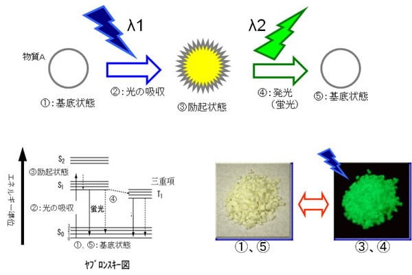 対象の鉱物にX線や紫外線が当てられると、その光が持つエネルギーを吸収することで、鉱物を形作っている素粒子の中の電子が動いて不安定な状態になり、それが元に戻るときに、動いた際に発生した余分なエネルギーを電磁波として外に出します。その電磁波が光として見えるのが蛍光です。